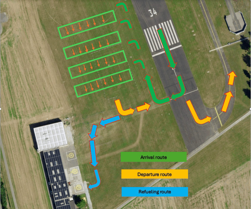 - Aircraft requiring fuel should proceed directly after landing to the refuelling area, following the blue arrows. Please ensure that only one aircraft at a time occupies the helicopter stands, as helicopter arrivals and departures may occur. After refueling, proceed to the green parking area.
